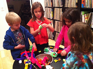 Fuzzoodles are kind of a cross between gigantic pipe cleaners and Mr Potato Head. They're huge chenille noodles that kids can bend and twist into anything they dream about. Kits range from $6.99 for a small kit to $19.99 for a Big Box set and are available at Walmart, Toys R Us and online at www.buyfuzzoodles.com. Most of the kids who came to the party had seen Fuzzoodles on TV and were excited about them immediately. It was fun to see boys and girls of all ages (the youngest was 18 months and the oldest is almost 7) manipulate the fuzzy wires and act out stories with them.